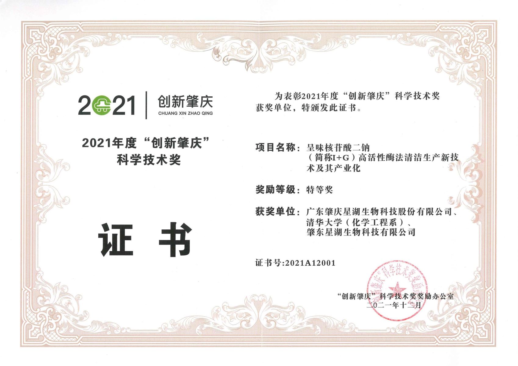 12月11日,2021年度“創(chuàng)新肇慶”科學(xué)技術(shù)獎(jiǎng)?lì)C獎(jiǎng)儀式在肇慶市端州區(qū)福澳假日酒店舉行,我司“《呈味核苷酸二鈉(簡稱I+G)高活性酶法轉(zhuǎn)化清潔生產(chǎn)新技術(shù)及其產(chǎn)業(yè)化》”項(xiàng)目獲得本年度肇慶市科學(xué)技術(shù)獎(jiǎng)特等獎(jiǎng),該項(xiàng)目主要完成人、公司總經(jīng)理助理蔡友華代表公司領(lǐng)獎(jiǎng)。