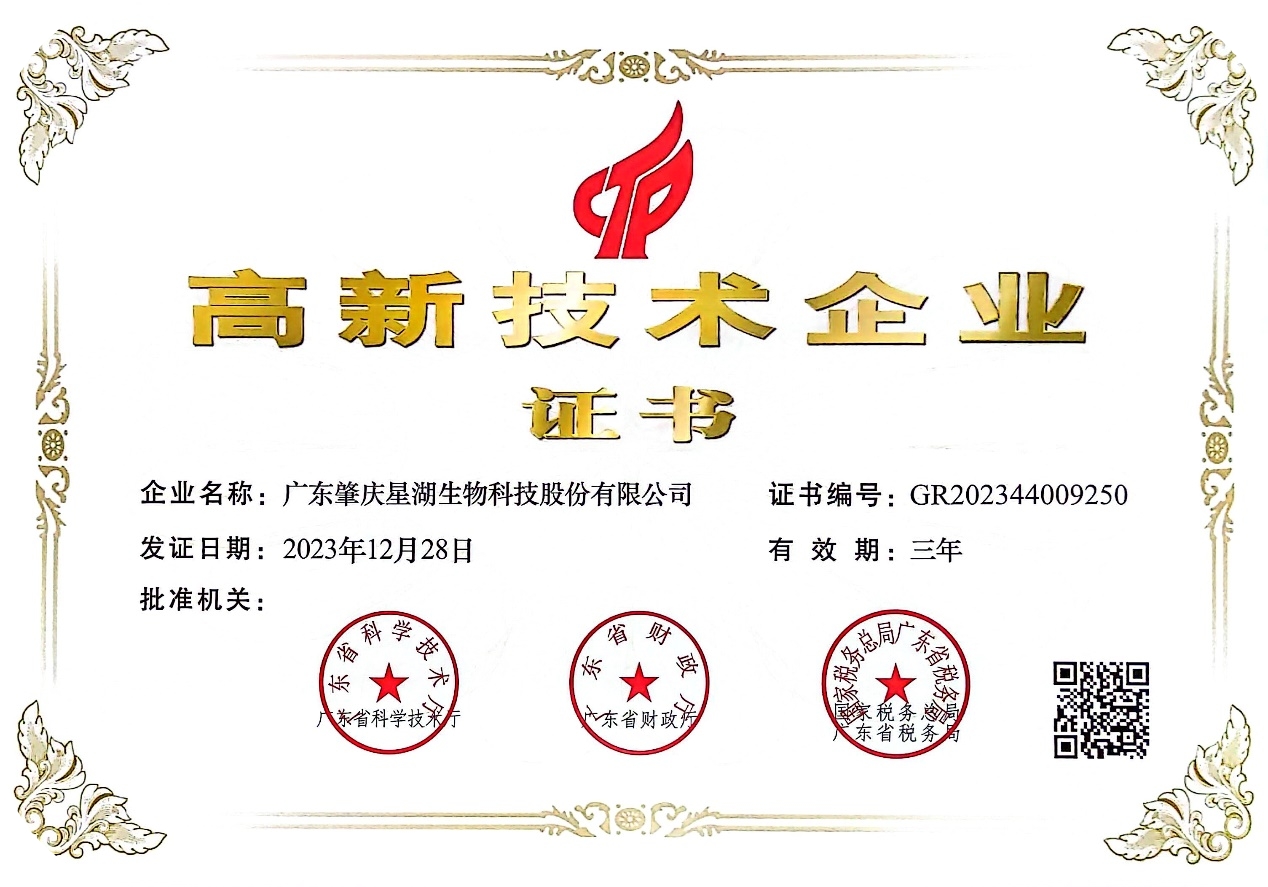 近日,星湖科技收到由廣東省科學(xué)技術(shù)廳、廣東省財政廳、國家稅務(wù)總局廣東省稅務(wù)局聯(lián)合頒發(fā)的高新技術(shù)企業(yè)證書,星湖科技順利通過高新技術(shù)企業(yè)重新認(rèn)定,這是對公司技術(shù)創(chuàng)新能力的充分認(rèn)可。