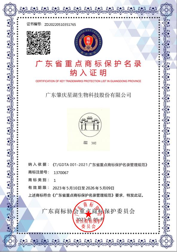 2023年5月10日,正值中國(guó)第七個(gè)品牌日之際,2022年度廣東省重點(diǎn)商標(biāo)保護(hù)名錄正式發(fā)布,星湖科技品牌商標(biāo)“星湖”和“粵寶”納入《廣東重點(diǎn)商標(biāo)保護(hù)名錄》,這是對(duì)星湖科技品牌價(jià)值和市場(chǎng)地位的高度認(rèn)可,彰顯了品牌實(shí)力和市場(chǎng)價(jià)值。